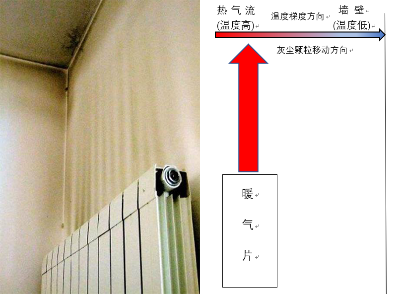 熏黑的原因不是买到了山寨的暖气片,而是所谓的热泳现象,又叫索瑞特现象:在流体中有稳定温度梯度存在时,流体中的固体颗?;岢盼露冉系偷姆较蛟硕6ㄐ岳纯矗呶虑蛄魈宸肿釉硕缌?,对固体颗粒的撞击力更大,就把固体颗粒“推”到低温的地方去了。简单来说,因为暖气片和它背后/上方的冷墙面有温度梯度,空气在流过它们之间时,颗粒物会吸附到较冷的墙面上,导致墙壁被熏黑了。