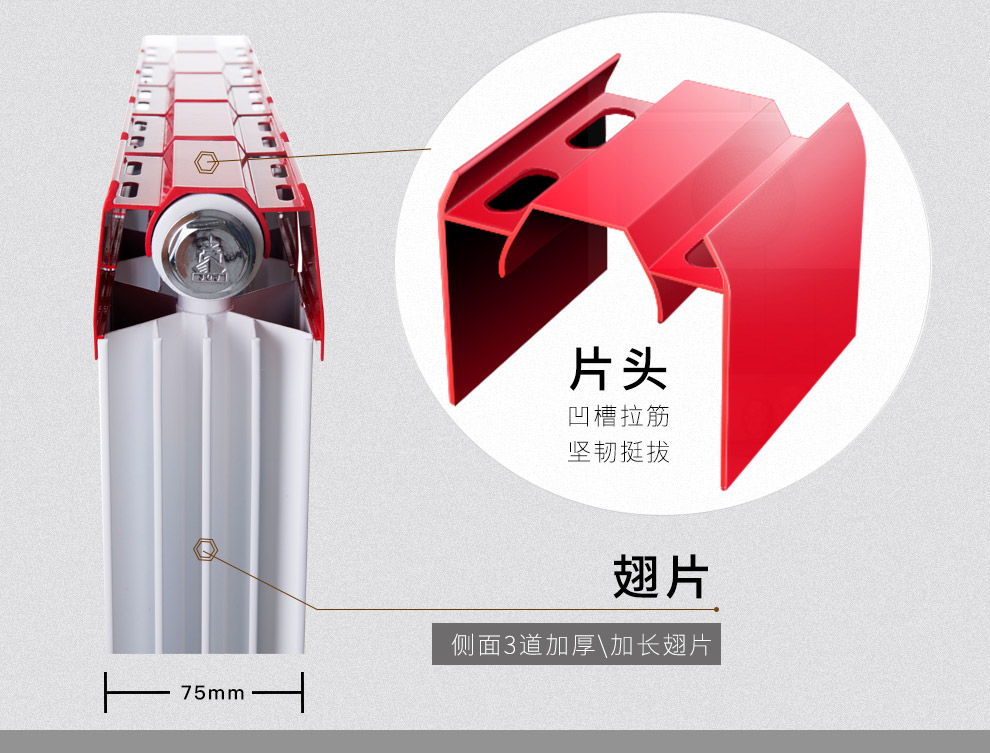 铜铝复合明装暖气片的厚度关系到散热器的使用寿命,最简单的鉴别方法就是抬起一组暖气片掂掂其重量。